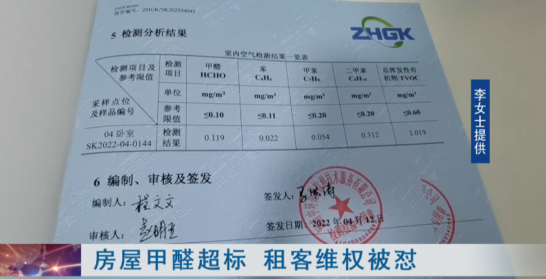 檢測(cè)報(bào)告顯示,李女士房間內(nèi)甲醛等有害物含量均超標(biāo),更讓人揪心的是,李女士隔壁房間租住的是一對(duì)年輕夫妻,妻子已經(jīng)懷孕,當(dāng)時(shí)這對(duì)夫妻也請(qǐng)檢測(cè)機(jī)構(gòu)進(jìn)行了檢測(cè)。
