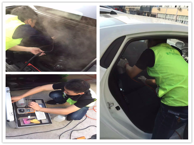 施工流程: 第一步檢測,提前關車窗1小時檢測甲醛是否超標,第二步治理,暴曬半小時或開暖氣20分鐘,第三步使用蒸汽機在車里面高溫熏蒸20分鐘,第四步使用凈味素及光觸媒在后備箱及車內座椅、頂棚、坐墊進行全方位噴涂產品、噴慢點,噴濕噴均勻。儀表方向盤音響少噴,再封閉5小時。后期多開車窗通風。